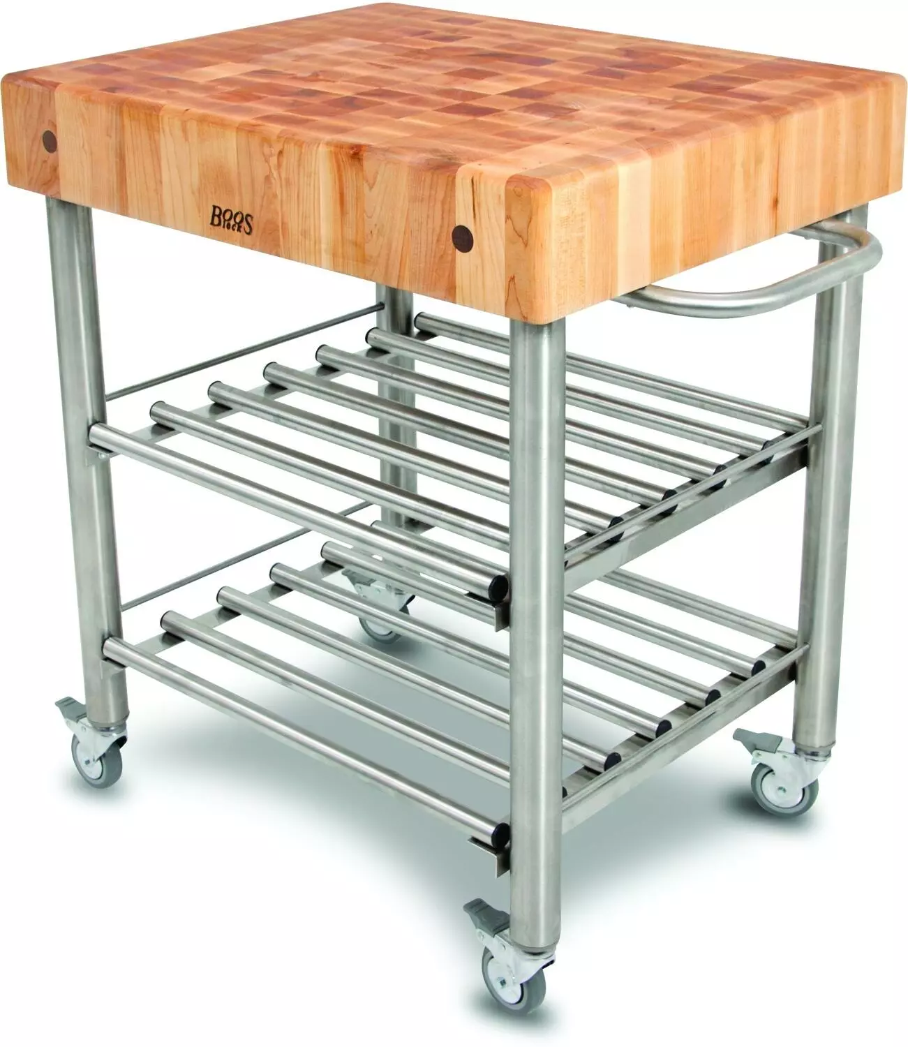 Boos Blocks Gourmet Küchenwagen aus Ahorn mit 2 Einlegeböden. Mobiler Gourmet Vorbereitungstisch/ Küchenarbeitsplatz auf Rollen. Aus nordamerikanischem Ahorn Stirnholz gefertigt. Mit Einlegeböden und Handtuchhalter aus Edelstahl.
