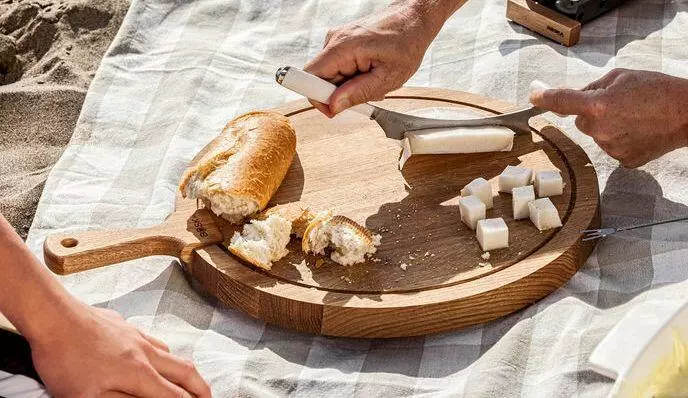 Käsebrett Friends L. Aus hochwertigem, weißen Eichenholz und mit stabilem Griff zum Anrichten verschiedener Käsevariationen.