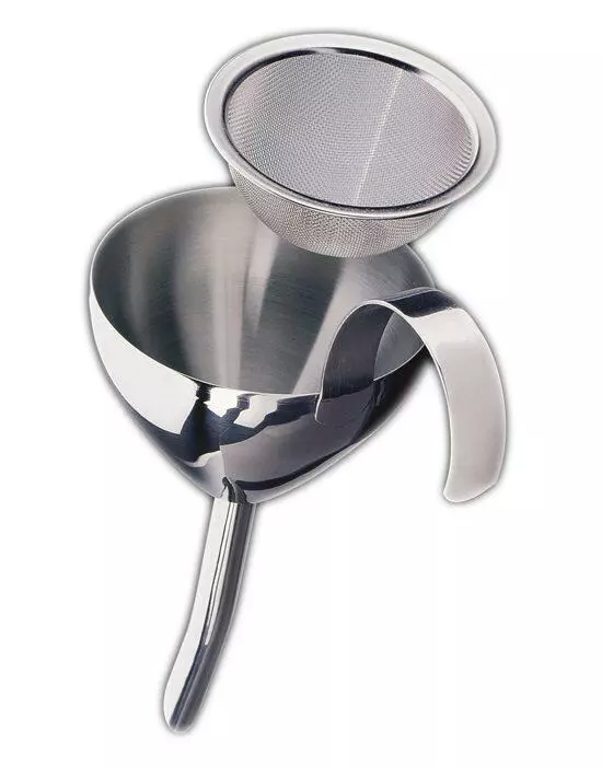 Durch die gebogene Form des Auslaufs kann Wein sanft an der Gefäßwand ablaufen und bringt das Aroma des Weins besser zur Entfaltung. Der feinmaschige Siebeinsatz hält den Weinstein im Trichter zurück und ist herausnehmbar.