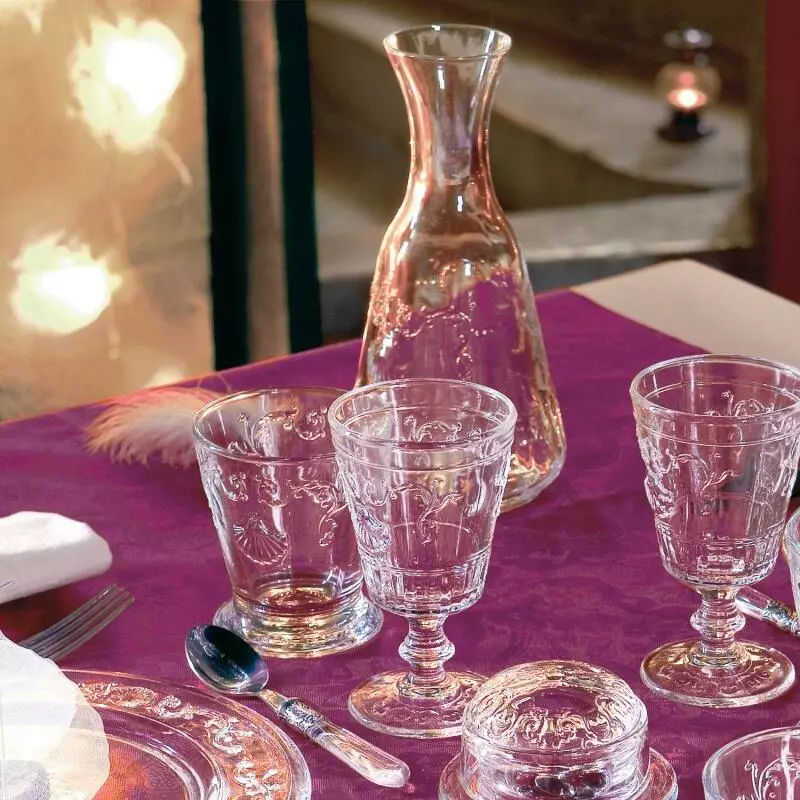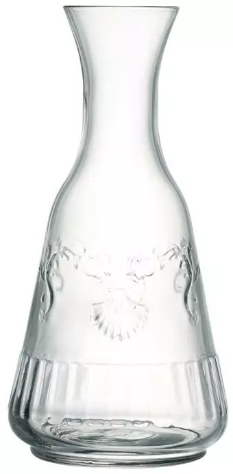 La Rochère Karaffe Versailles 72 cl. Mundgeblasene Karaffe mit barockem Reliefdekor aus Blumenranken und Jakobsmuscheln.