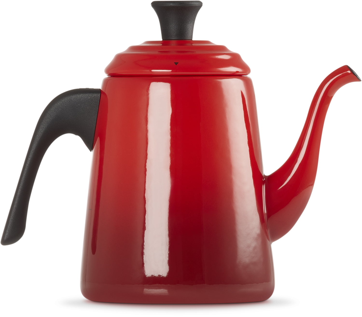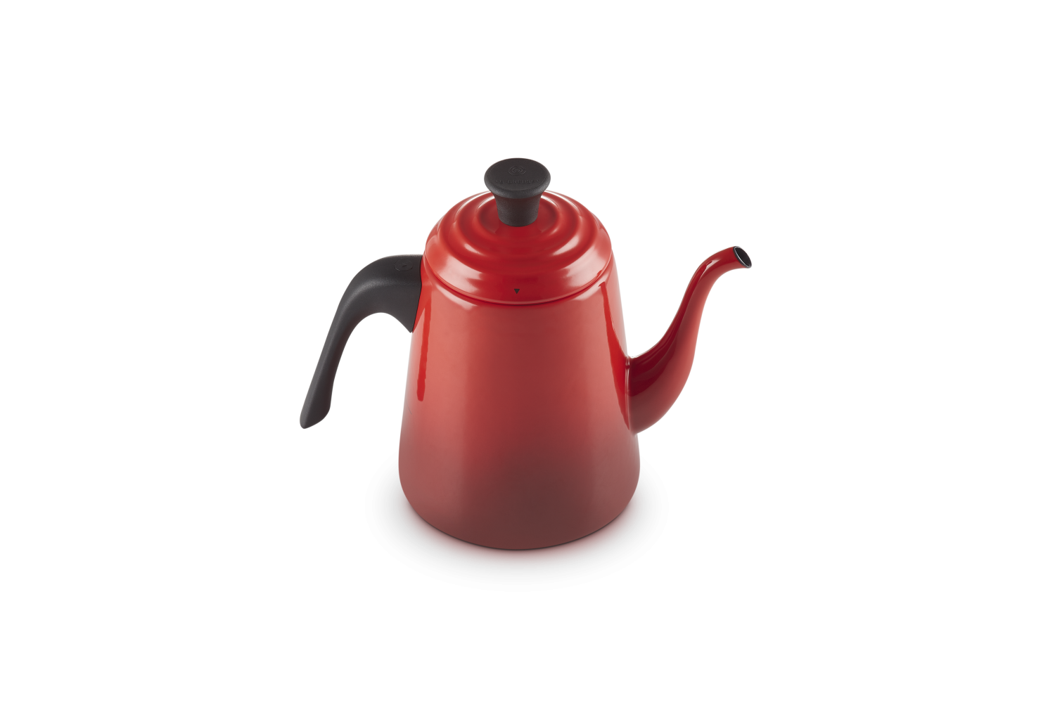 Le Creuset Wasserkessel Drip in kirschrot. Der Wasserkessel mit schmalem, geschwungenem Hals ist aus emailliertem Karbonstahl und farblich auf das