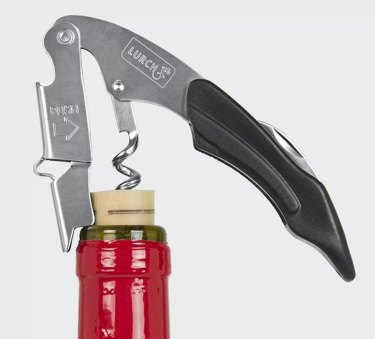Mit dem Kellnerkorkenzieher von Lurch lassen sich Weinflaschen schnell und sicher Öffnen ohne Korkbruch. Der patentierte 2-Stufen-Hebel eignet sich sogar für lange Korken. Mit dem integrierten Messer ist das Öffnen von Flaschenmanschetten kein Problem.
