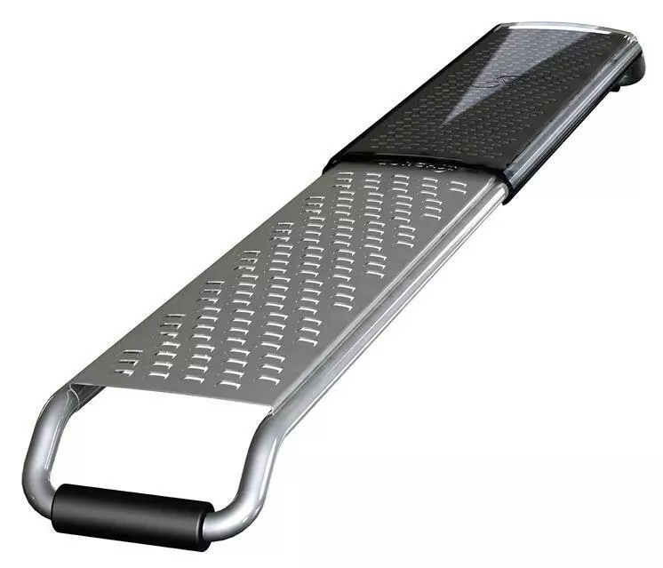 Mit RazorTech hält eine neue, intelligente Klingentechnik Einzug in die Küche. Während bei herkömmlichen Reiben die Flächen meistens aus Blech bzw. bei höherwertigen Produkten aus Edelstahl gestanzt werden, wird der Edelstahl beim Foto-Etching exakt herausgeätzt. Dadurch entstehen besonders scharfe Schneidkanten, die das Schnittgut nicht mehr bröselig zerreiben, sondern es tatsächlich schneiden. Das Verfahren, das ursprünglich bei der Produktion von Mikro-Computerbauteilen angewendet wurde, kommt bei