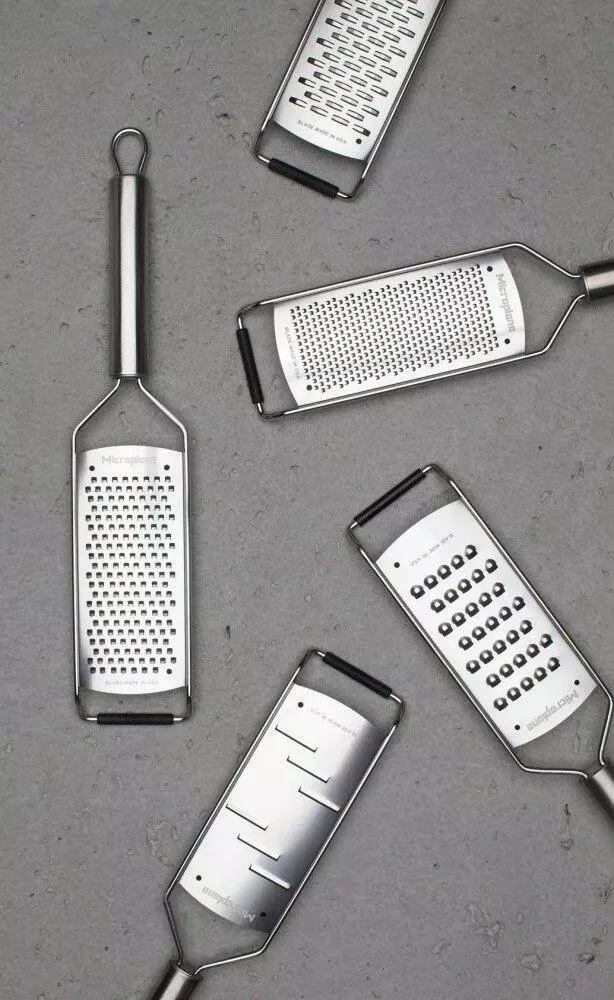 Bei Microplane Professional gibt es fünf Klingenvarianten zur Auswahl: Grob, Mittelgroße Schneide, Fein, Große Raspel, und Sehr Grob.