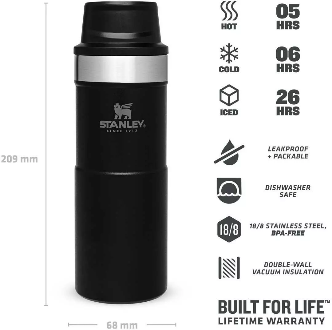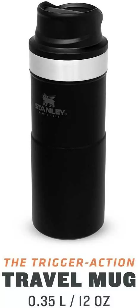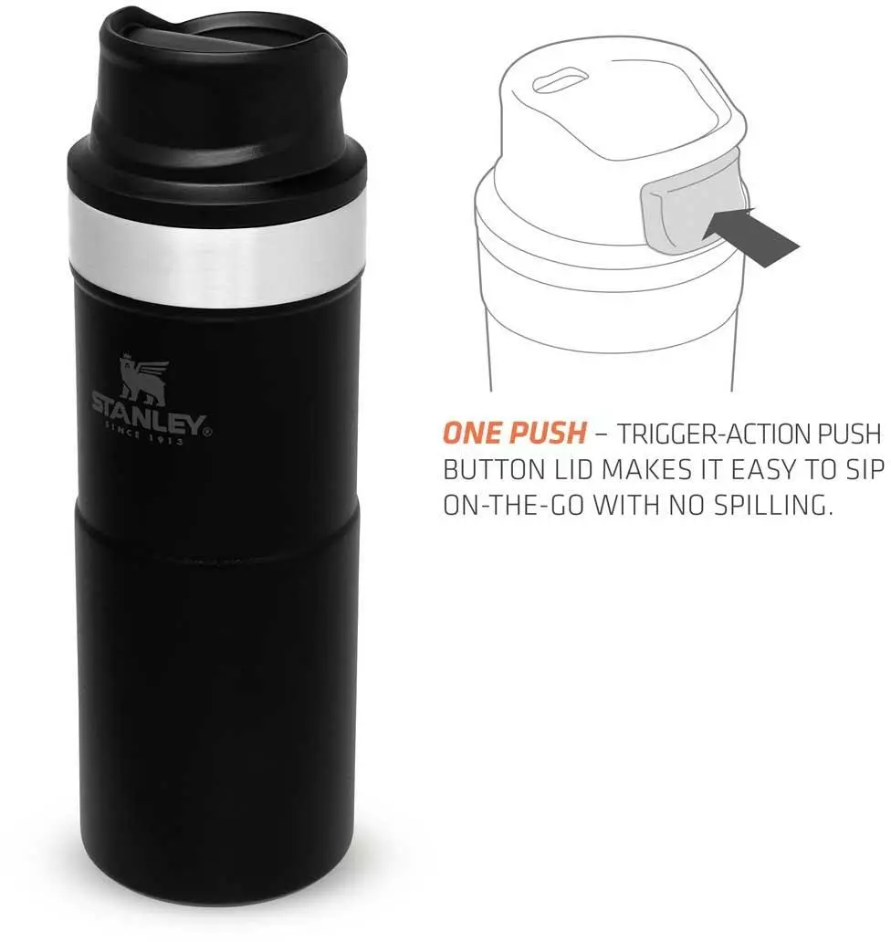 Mit der Slim Line Version des TRIGGER-ACTION TRAVEL MUG führt Stanley eine überarbeitete Version der einhändig bedienbaren Becher ein. Durch das neue, schlankere Design liegt der Becher noch angenehmer in der Hand und passt in alle gängige PKW-Getränkehalter. Das Drücken der großen und sehr leichtgängigen Taste zum Aktivieren der Trinköffnung mit einer Hand macht Trinken – on the go – zum Vergnügen. Der schwarze Trinkbecher aus rostfreiem 18/8-Edelstahl mit Vakuumisolierung besitzt ein Fassungsvermögen von 354 ml und hält Getränke bis zu 5 Stunden heiß oder 6 Stunden gekühlt. Der TRIGGER-ACTION TRAVEL MUG ist komplett spülmaschinenfest und auslaufsicher. BPA-frei.