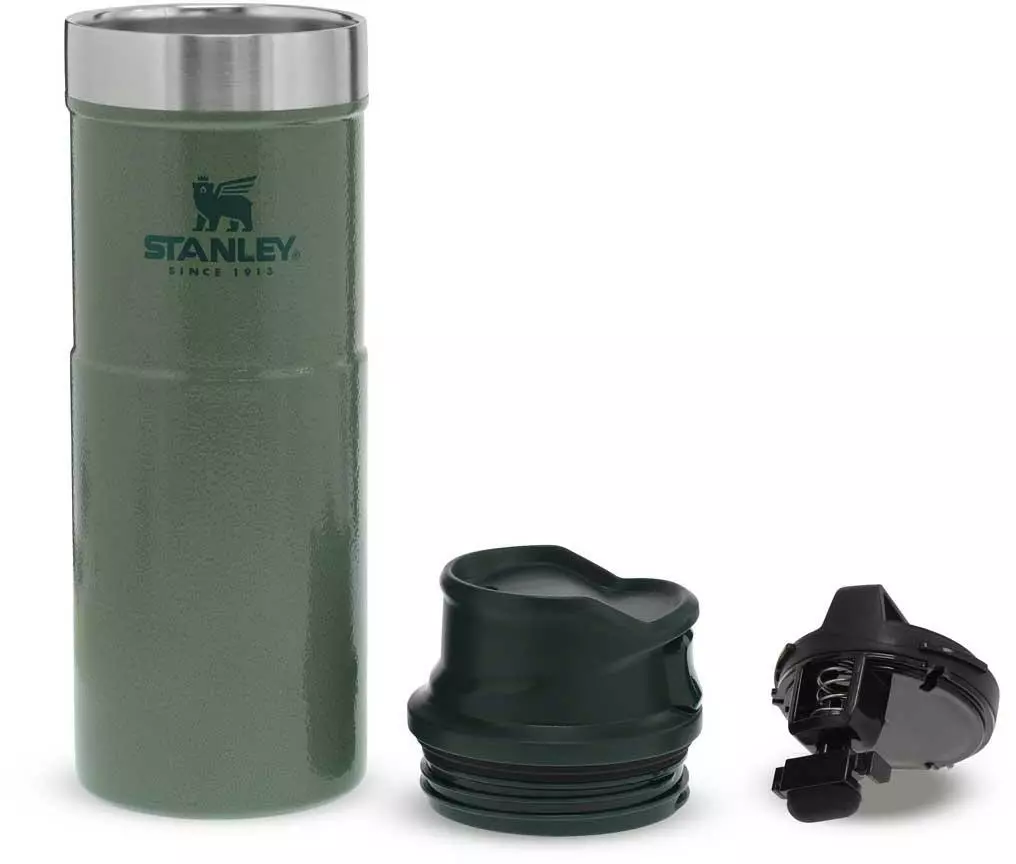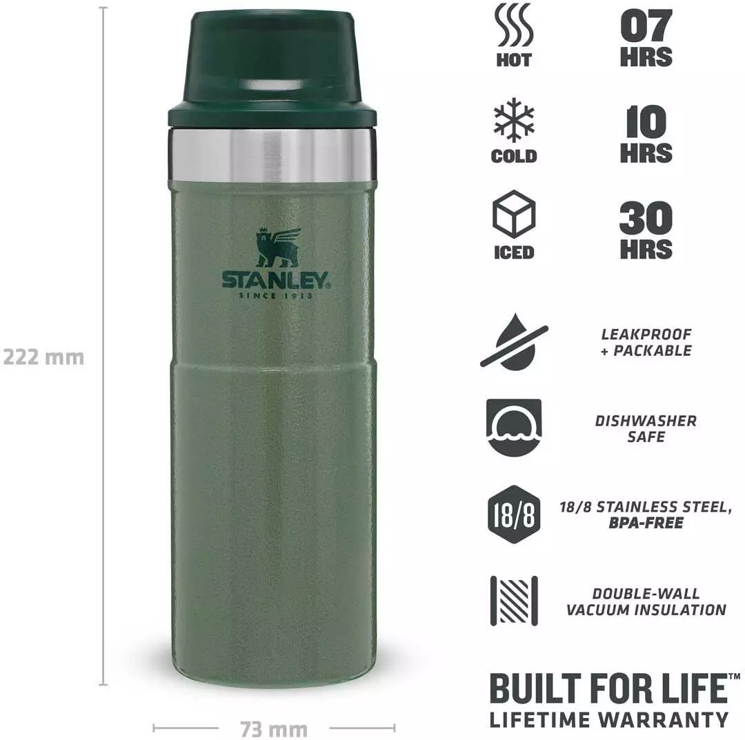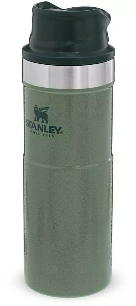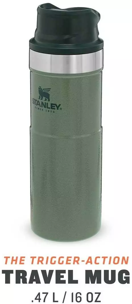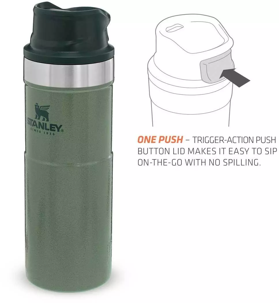 Mit dem Stanley CLASSIC TRIGGER-ACTION TRAVEL MUG in Hammertone Green führt Stanley eine neue Generation der Becher mit Einhandbedienung ein. Das Drücken der großen und sehr leichtgängigen Taste zum Aktivieren der Trinköffnung mit einer Hand macht Trinken – on the go – zum Vergnügen. Der Trinkbecher aus rostfreiem 18/8-Edelstahl mit Vakuumisolierung besitzt ein Fassungsvermögen von 473 ml und hält Getränke bis zu 7 Stunden heiß oder sogar 10 Stunden gekühlt. Der TRIGGER-ACTION TRAVEL MUG ist komplett spülmaschinenfest, auslaufsicher und passt in gängige PKW-Getränkehalterungen. BPA-frei.