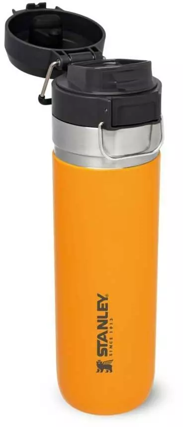 Ob für die Outdoor-Tour, den Sport oder einfach On The Road, die Stanley QUICK-FLIP WATER BOTTLE ist der ideale Begleiter gegen den Durst. Die auslaufsichere Flasche ist mit einem innovativen, zweistufigen Sicherheitsverschluss ausgestattet. Beim Transport wird der Verschluss gegen unbeabsichtigtes Öffnen von einem Edelstahlbügel fixiert. Wird dieser gelöst und der Push-Button Knopf gedrückt, flippt der Deckel federunterstützt auf. Die Trinkflasche aus rostfreiem 18/8-Edelstahl mit Vakuumisolierung besitzt ein Fassungsvermögen von 709 ml und hält Getränke bis zu 8 Stunden heiß oder 12 Stunden gekühlt. Die Flasche passt in gängige PKW-Getränkehalter und ist mit einem beweglichen Bügel zum Anhängen an den Rucksack oder Tragegriff ausgestattet. Alle Teile können in der Spülmaschine gereinigt werden. BPA-frei.
